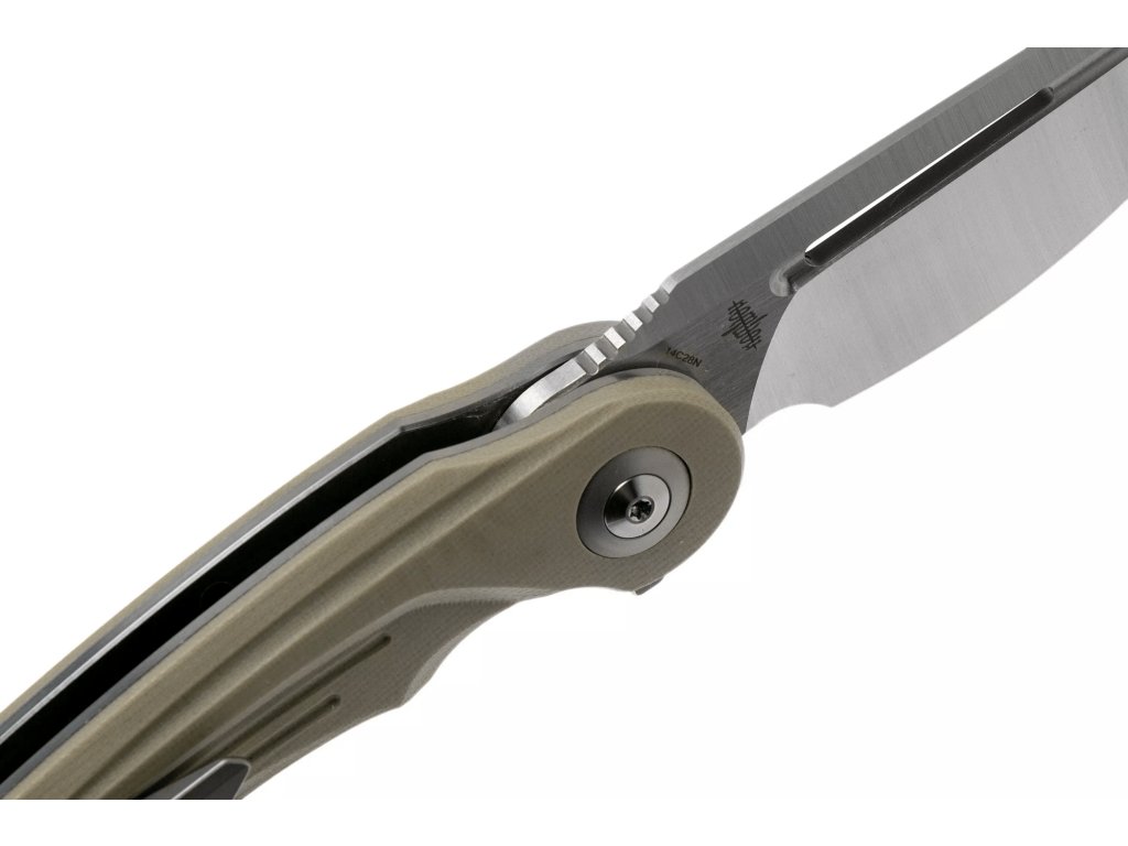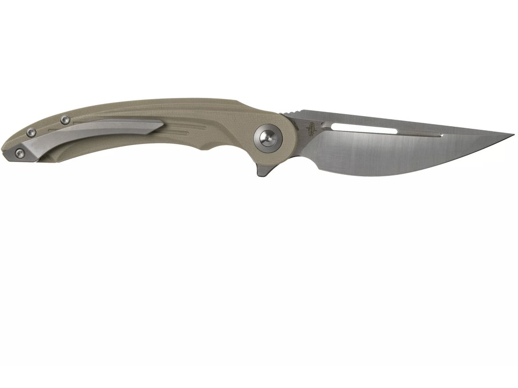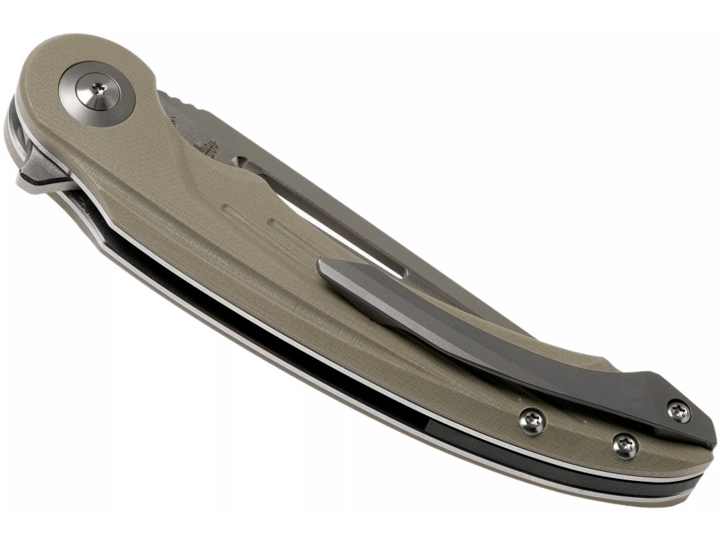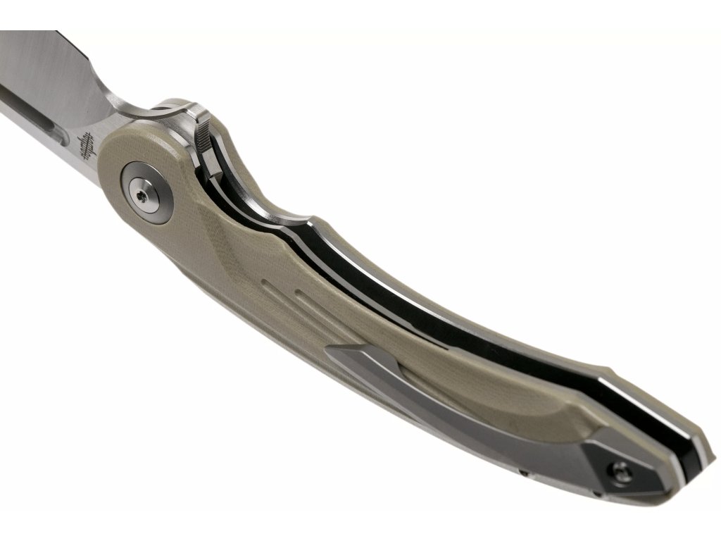 Ergonomiczna rękojeść z G10 gwarantuje pewny chwyt i dużą wytrzymałość mechaniczną. Tekstura poprawia kontrolę nad nożem, a smukły kształt ułatwia przenoszenie w kieszeni.