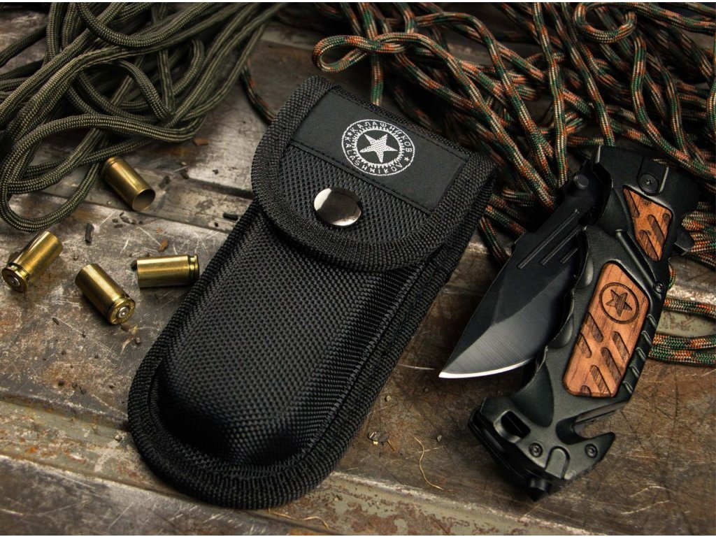 Aluminiowy korpus rękojeści z drewnianymi wstawkami oferuje pewny i komfortowy chwyt. Nóż posiada również dwa kluczowe elementy do sytuacji awaryjnych: