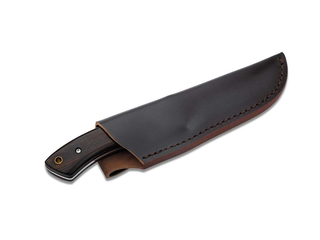 Ergonomiczna rękojeść z drewna hebanowego zapewnia pewny chwyt i wysoki komfort pracy. Duże jelce harmonijnie nawiązują do wzoru klingi, podkreślając klasyczny charakter noża. Mosiężny otwór na smycz dodaje funkcjonalności i podkreśla tradycyjny styl.