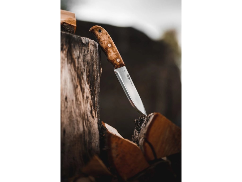 - Rękojeść z karelskiej brzozy: ergonomicznie ukształtowana, montowana mosiężnymi nitami.