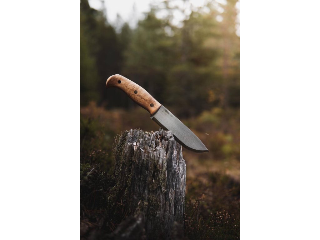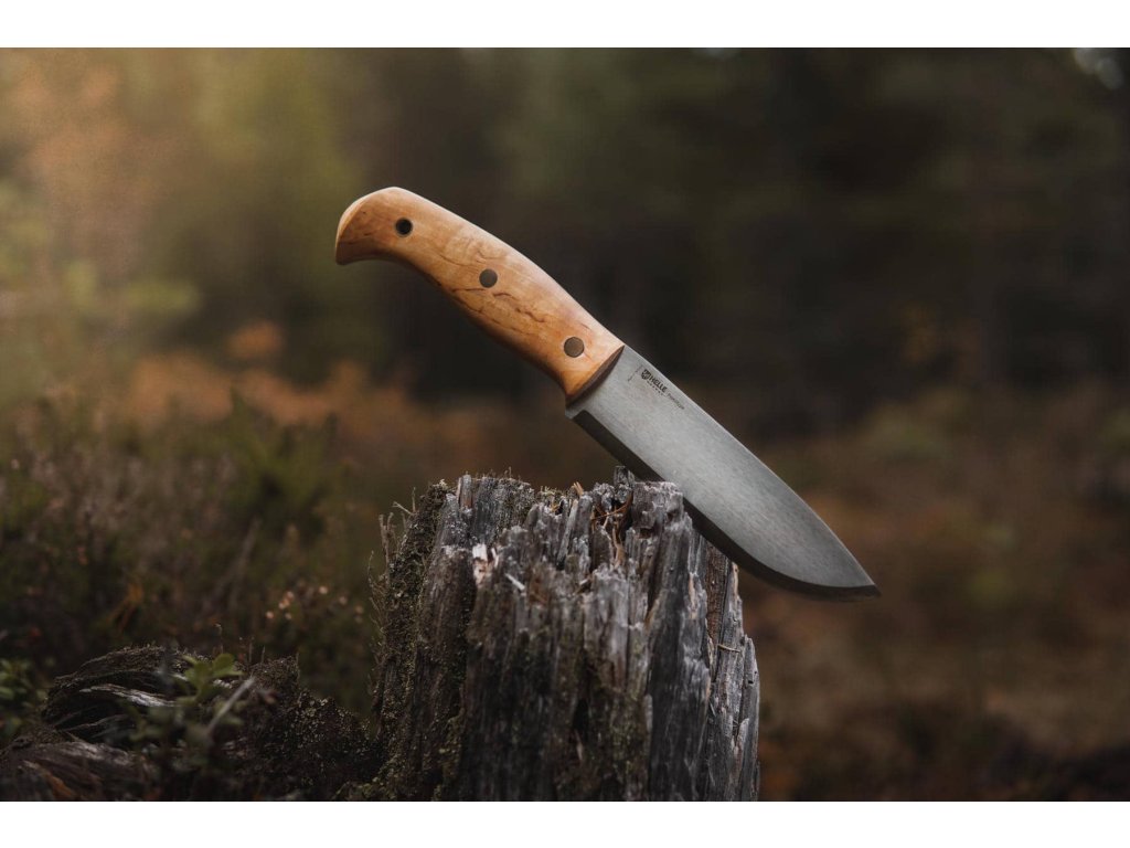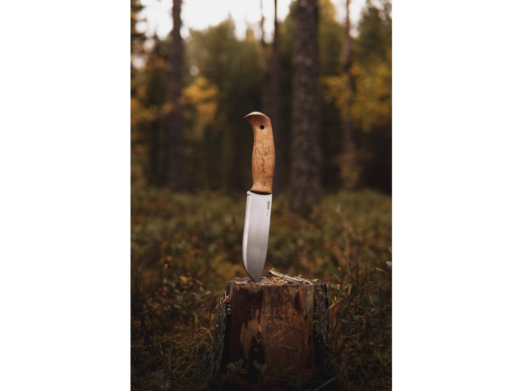 - Rękojeść z karelskiej brzozy – naturalny, wygodny chwyt, każdy egzemplarz jest unikatowy.