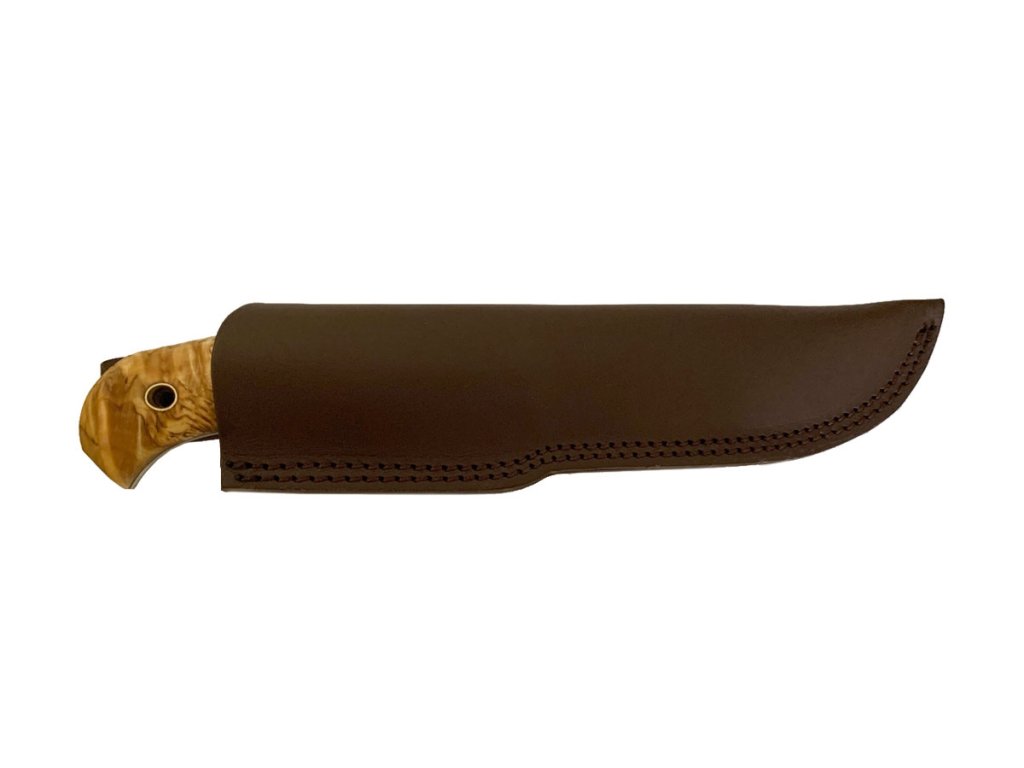 - Rękojeść z karelskiej brzozy: naturalna, wygodna, o niepowtarzalnym rysunku drewna.