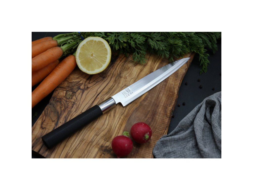 IVO Yanagiba SEKAI to klasyczny japoński nóż zaprojektowany specjalnie do precyzyjnego krojenia surowych ryb i mięsa. Jednostronnie ostrzona klinga z wysokiej jakości stali nierdzewnej gwarantuje ekstremalną ostrość, czyste cięcia i pełną kontrolę podczas przygotowywania sushi oraz sashimi.