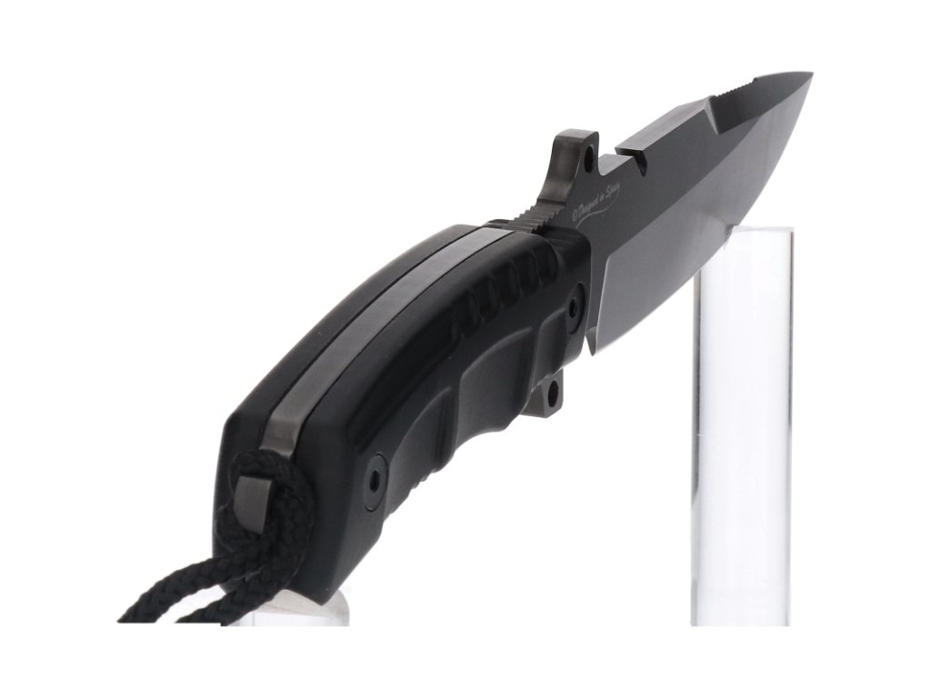 Pochwa kompatybilna z MOLLE posiada kieszeń z krzesiwem oraz paracordem. Sekcja ząbkowana na grzbiecie ostrza ułatwia efektywne użycie krzesiwa.