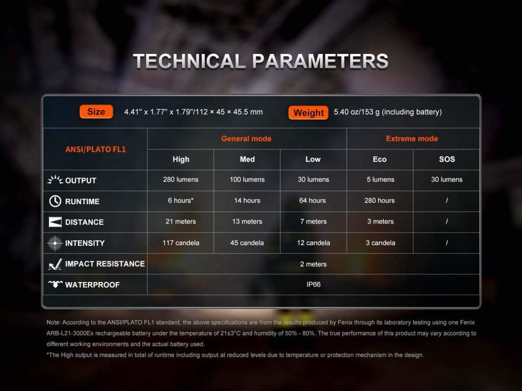 Dwie diody CREE XP-G3 zapewniają moc do 280 lumenów i zasięg 21 metrów. Dostępnych jest 5 trybów świecenia, w tym SOS, a maksymalny czas pracy to aż 280 godzin. Moduł świetlny można odpiąć i używać jako małej latarki ręcznej – w zestawie znajduje się stalowy klips.