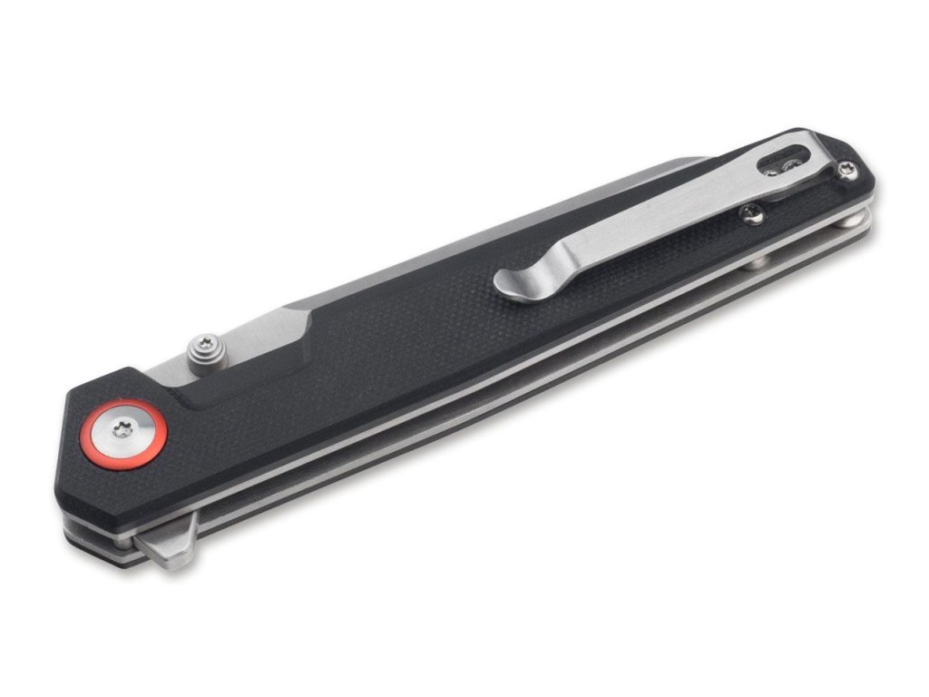 Czarna, teksturowana rękojeść z G10 zapewnia stabilność w dłoni, a linerlock chroni przed przypadkowym złożeniem ostrza.