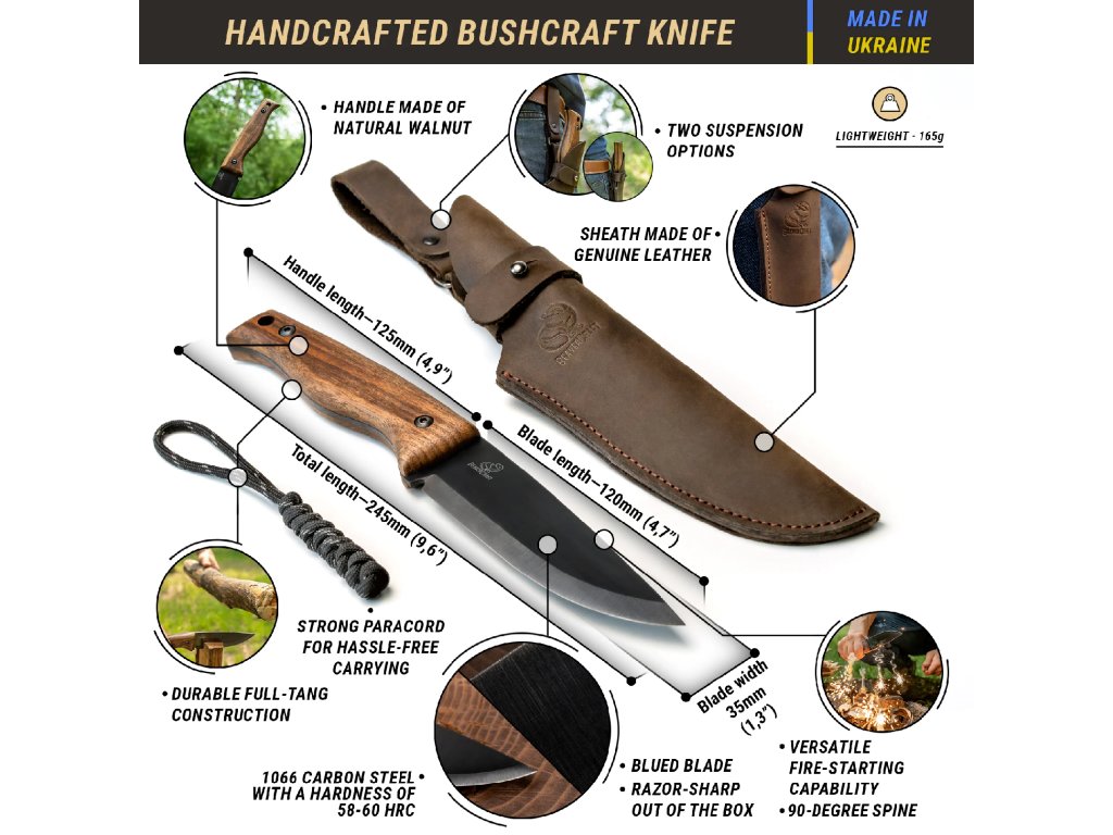 Karbonowa stal 1066 (58–60 HRC) gwarantuje wysoką wytrzymałość i długotrwałe trzymanie ostrości. Powłoka blued steel chroni przed korozją i nadaje nożowi elegancki, ciemny wygląd – idealny do pracy w wilgotnym środowisku.