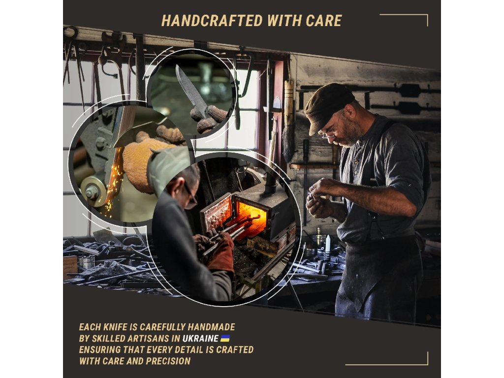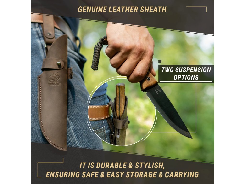 Nóż dostarczany jest w wytrzymałej, ręcznie szytej pochwie z naturalnej skóry. Pozwala ona na bezpieczne noszenie narzędzia na pasie – idealne rozwiązanie podczas trekkingu, bushcraftu czy polowania.