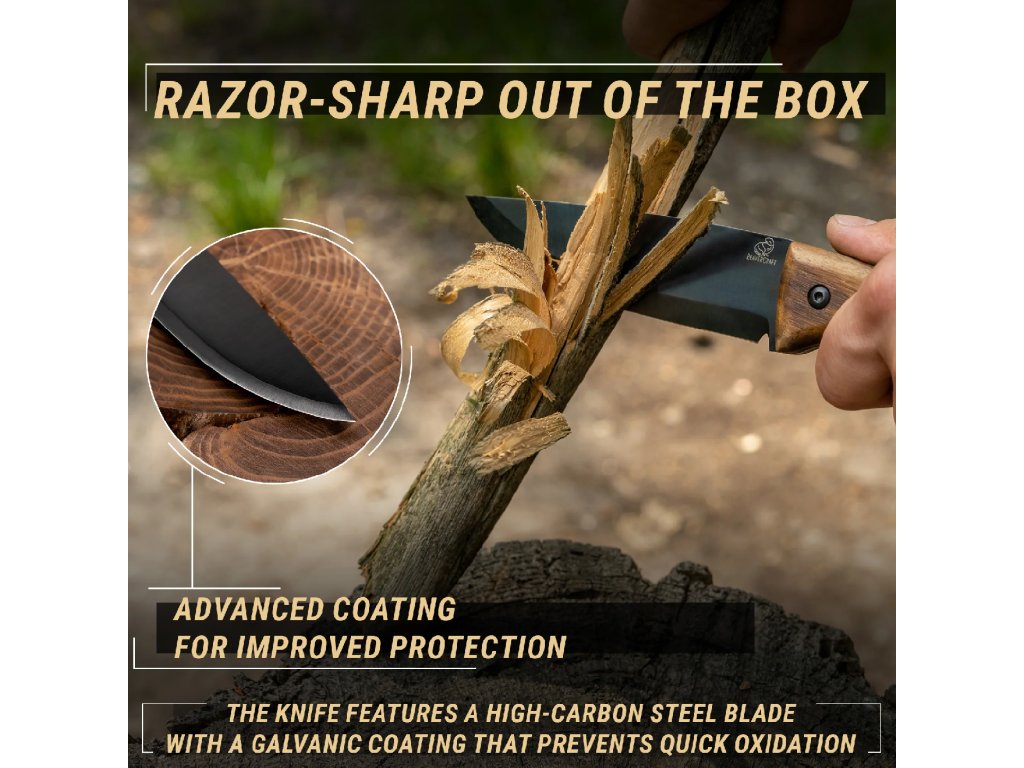 BSH3 Nightfall to narzędzie łączące funkcjonalność, trwałość i estetykę. Sprawdza się podczas codziennych zadań outdoorowych, pracy w drewnie, biwakowania i survivalu. Wykończenie blued zwiększa odporność, a kompaktowy rozmiar czyni go wygodnym partnerem każdej wyprawy.