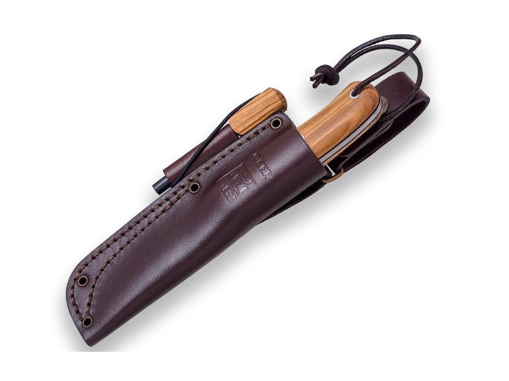 - Skórzana pochwa z krzesiwem: Ułatwia bezpieczne przenoszenie noża i rozpalanie ognia w każdych warunkach.