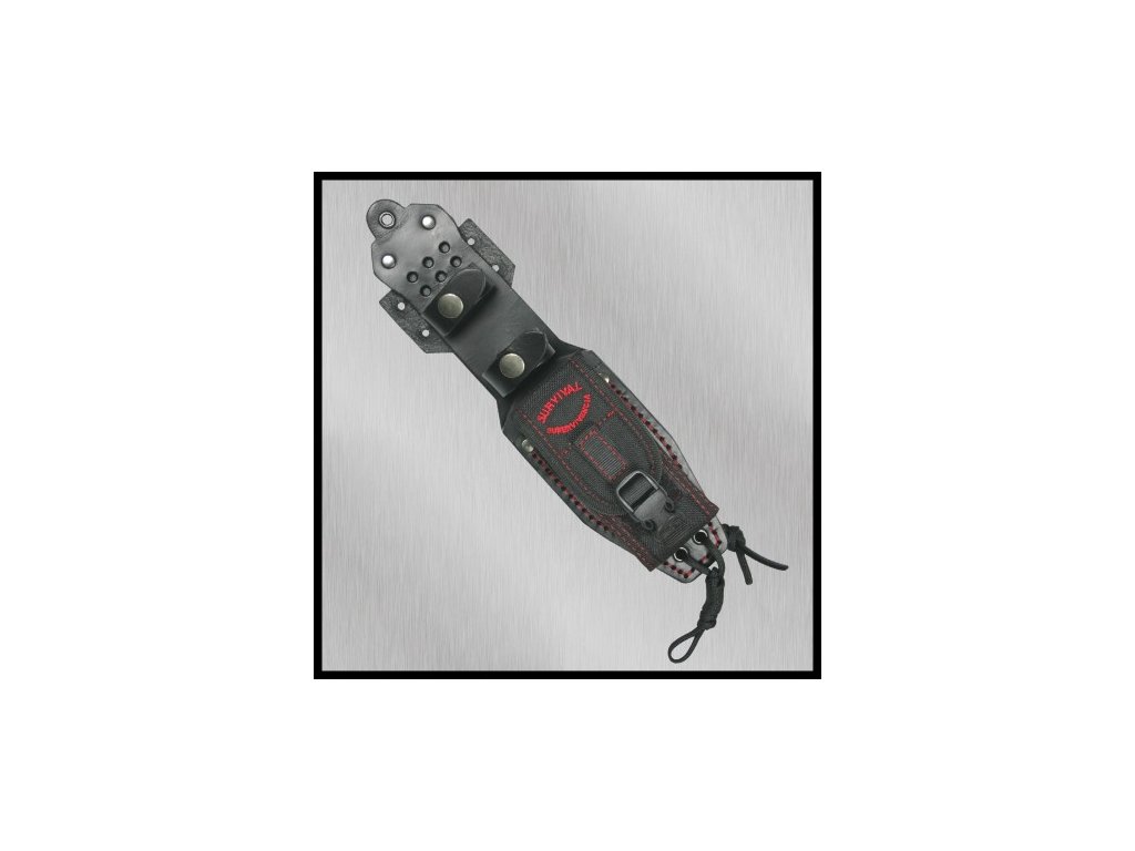 W komplecie znajdziesz skórzaną pochwę oraz dodatkowe nylonowe etui z krzesiwem, gwizdkiem i ostrzałką. To doskonały zestaw dla każdego, kto ceni przygotowanie i niezależność w terenie.