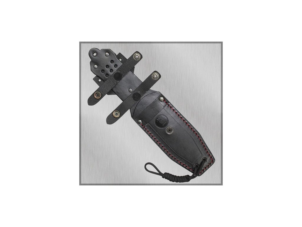 Ergonomiczna rękojeść wykonana z czarnej micarty gwarantuje pewny chwyt nawet w trudnych warunkach. Nóż posiada również stalowe oczko z dołączoną linką zabezpieczającą. W zestawie znajduje się solidna, czarna pochwa ze skóry naturalnej z tłoczonym logo producenta.
