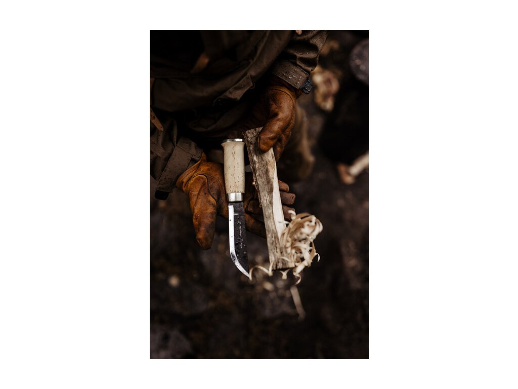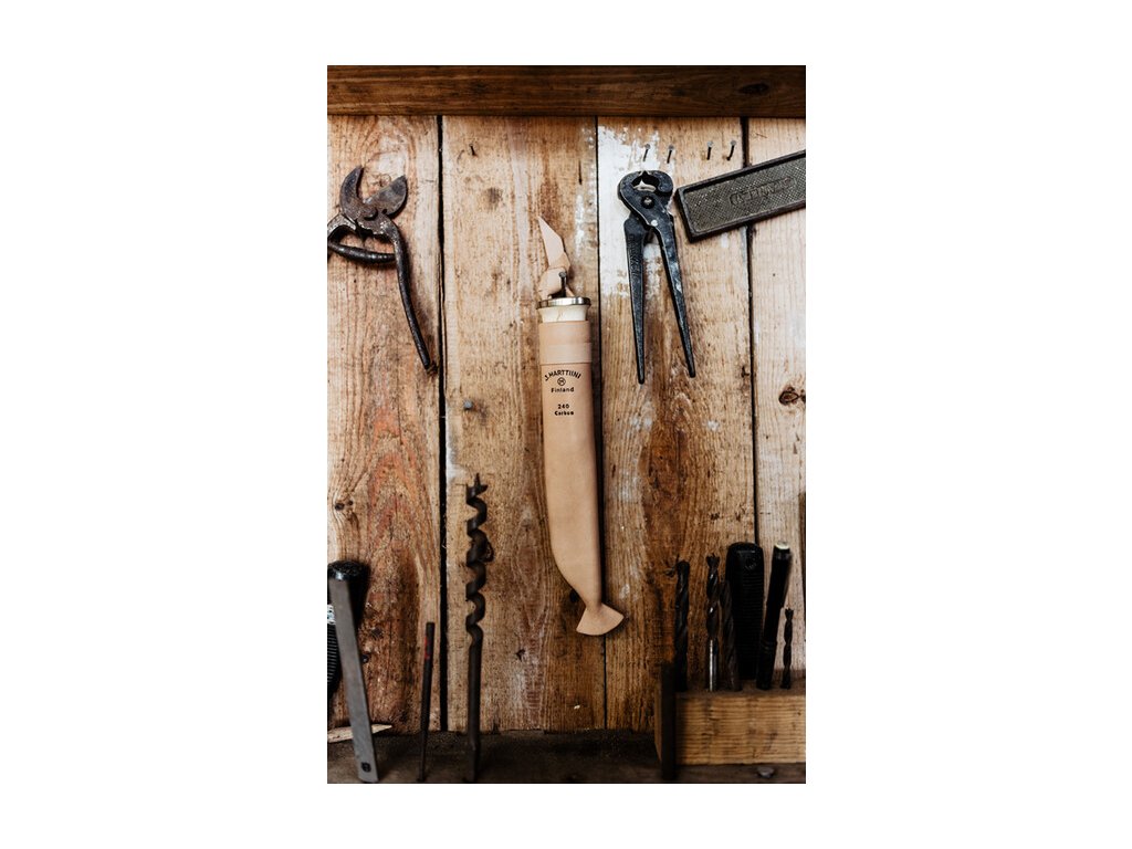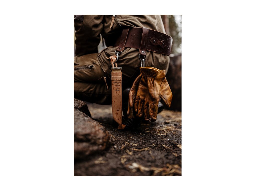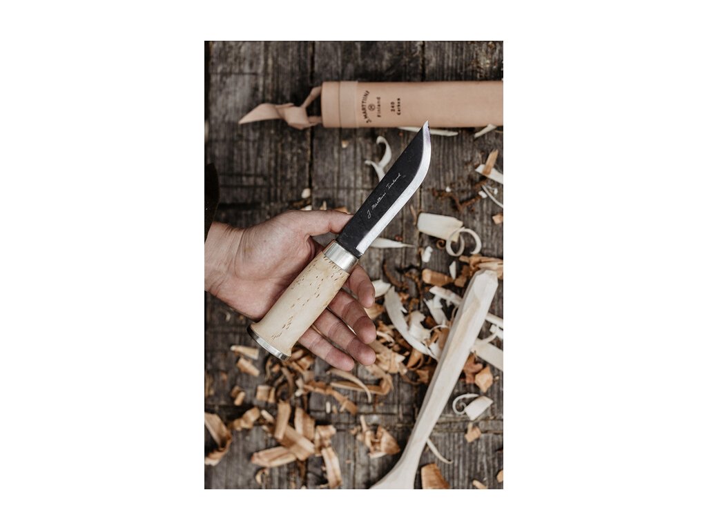 Marttiini Lapp Carbon 240 to idealne narzędzie dla myśliwych i entuzjastów dzikiej natury. Sprawdza się przy obróbce drewna, zwierzyny i cięższych zadaniach obozowych. Węglową stal należy po użyciu osuszać i oliwić, a brzozową rękojeść regularnie zabezpieczać woskiem lub olejem. Skórzaną pochwę warto konserwować balsamem do skóry.