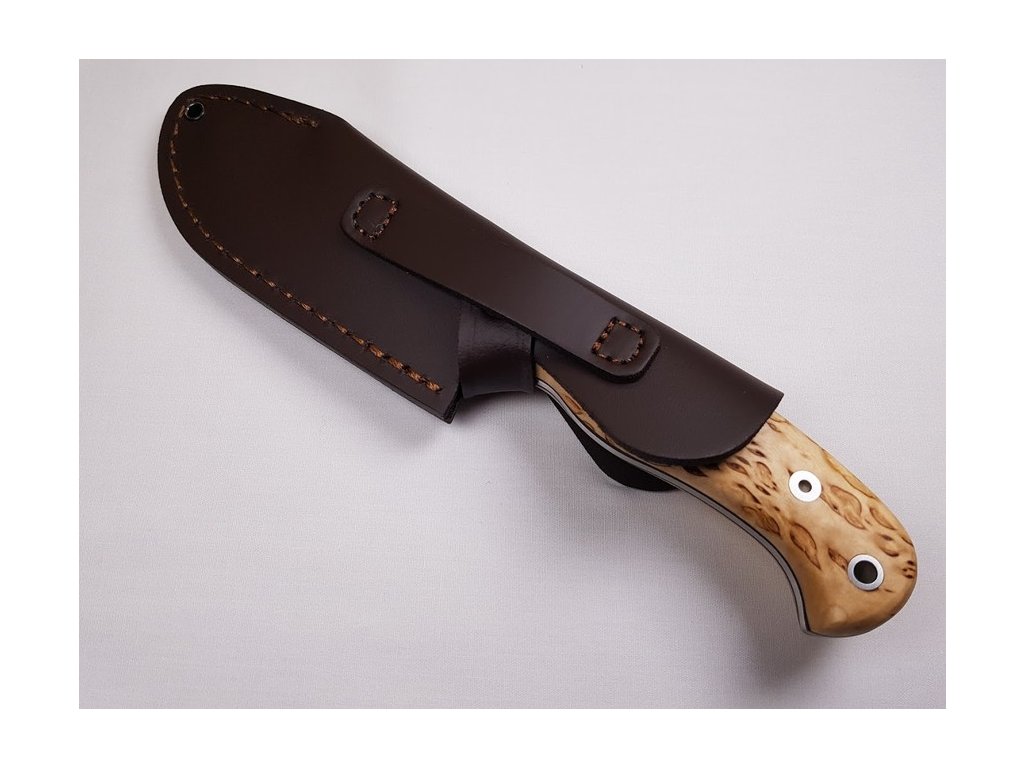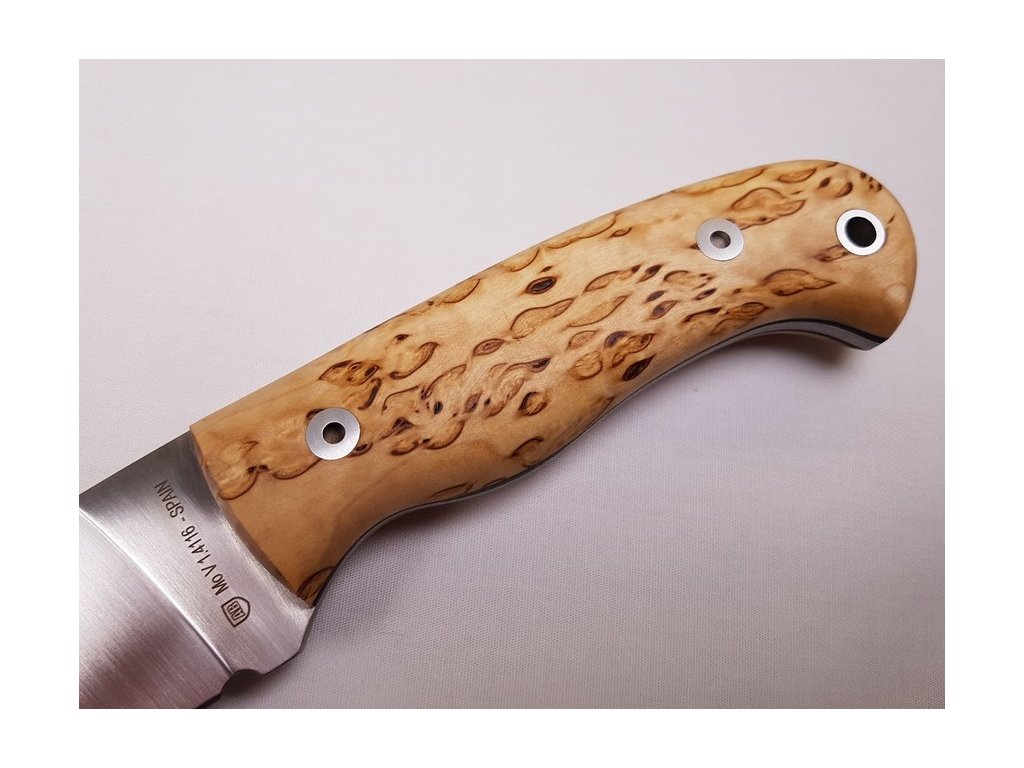 - Rękojeść z drewna brzozy kędzierzawej: naturalny materiał o wyjątkowym wyglądzie i świetnej ergonomii – każdy nóż jest unikalny 🌳.