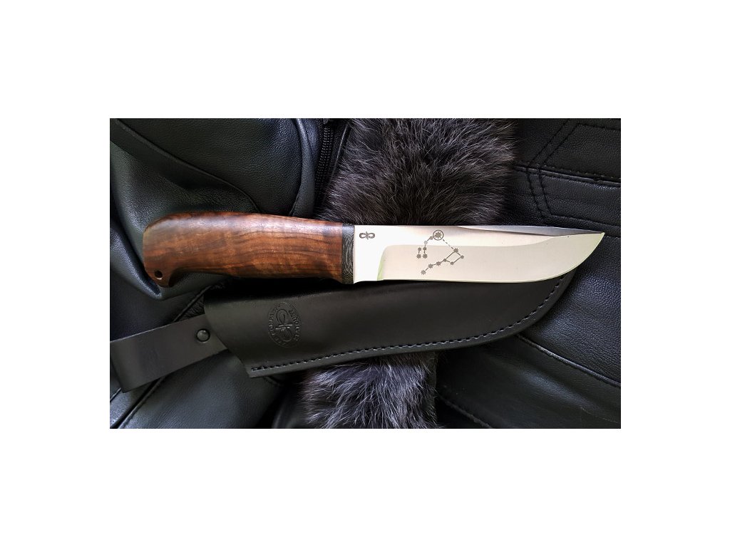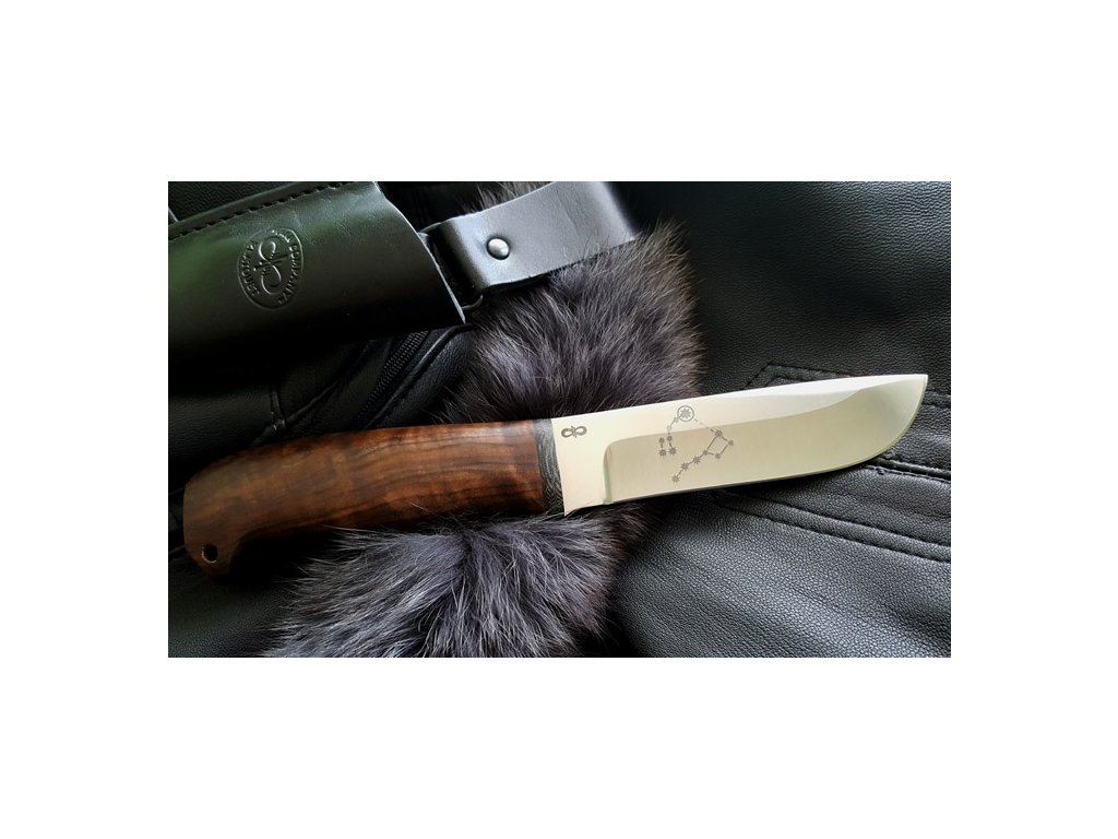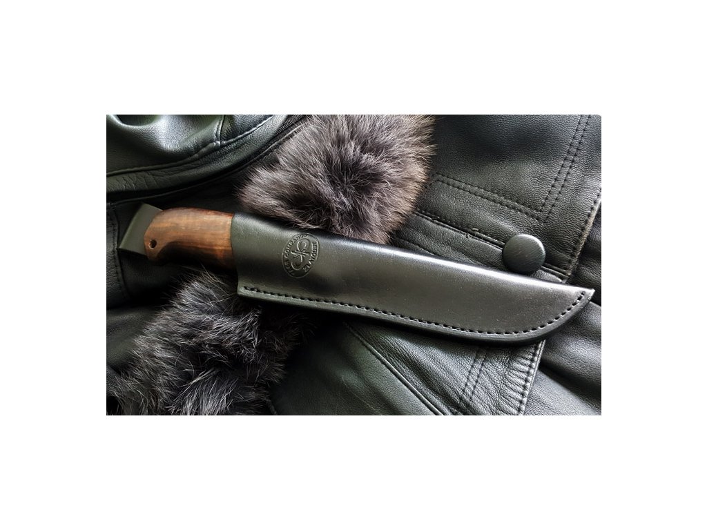 Rękojeść z orzecha zapewnia naturalny i wygodny chwyt, a skórzana pochwa z tłoczonym logo producenta pozwala na bezpieczne przenoszenie noża w terenie. Całość łączy funkcjonalność z pięknym wzornictwem i precyzyjnym wykonaniem – jak przystało na rosyjskiego producenta z miasta Zlatoust.