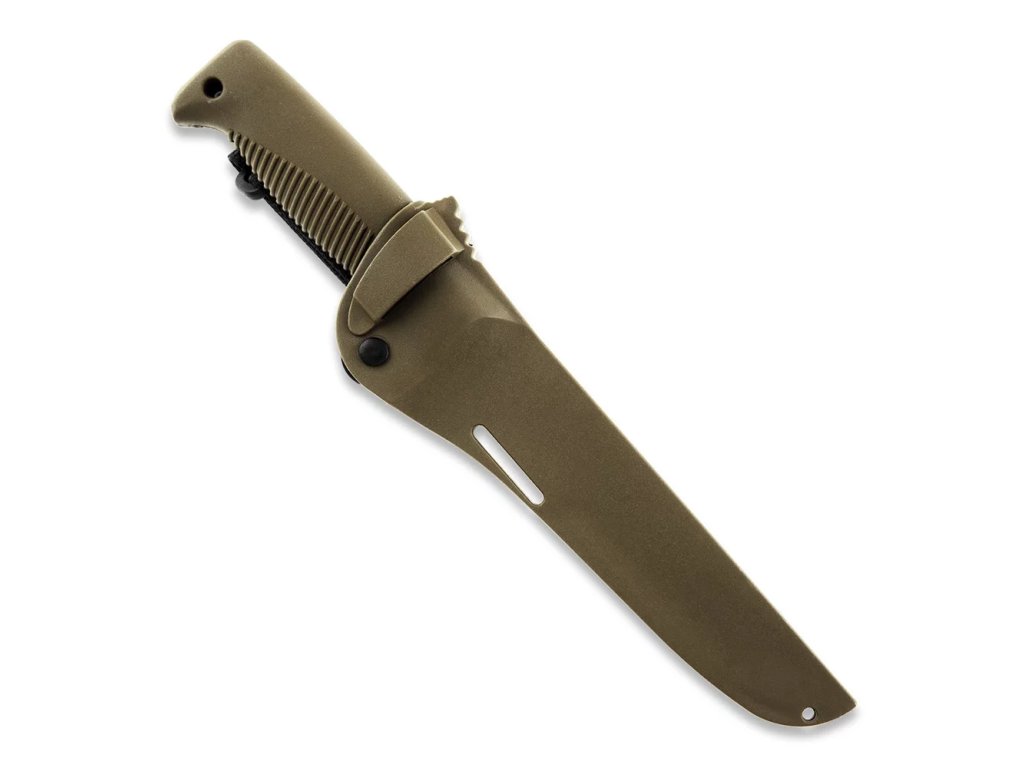 Ergonomiczna rękojeść TPE w kolorze coyote zapewnia doskonałą przyczepność w mokrych, zimnych i błotnistych warunkach. Konstrukcja full tang zwiększa trwałość i bezpieczeństwo użytkowania.