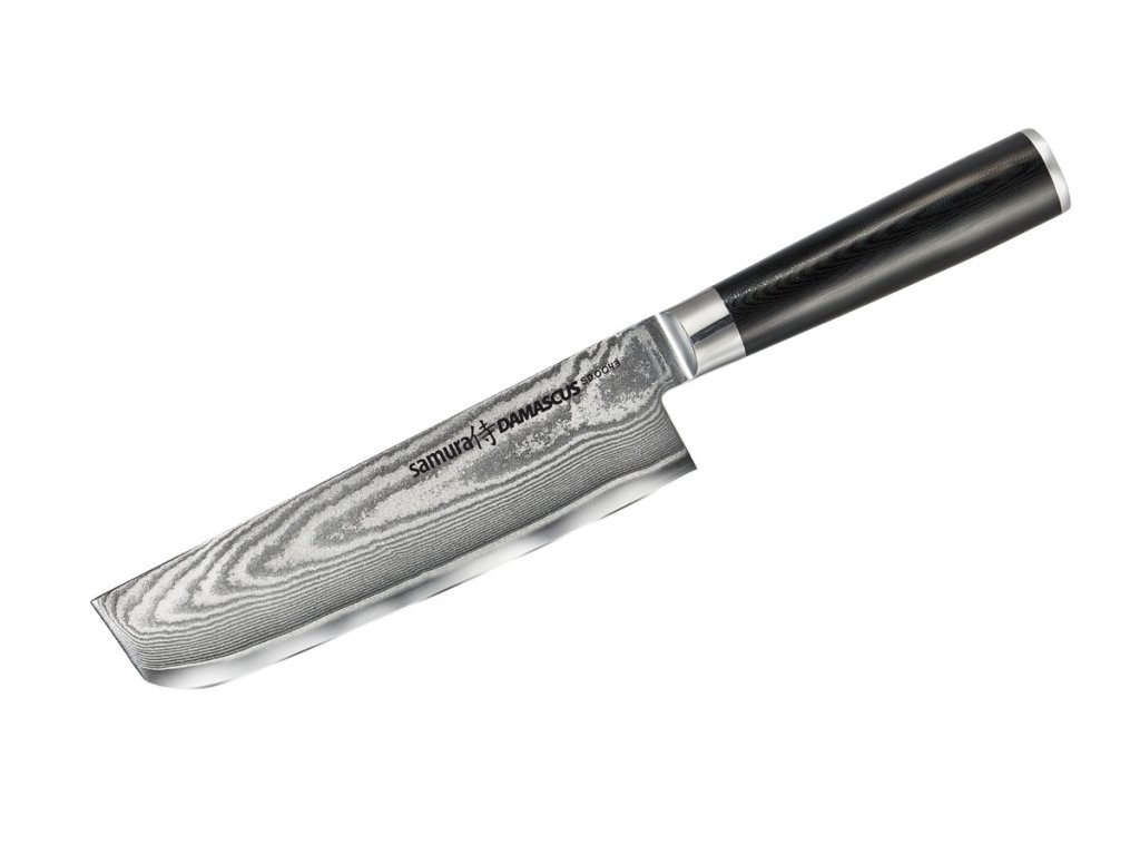 Samura Damascus Nakiri doskonale radzi sobie z cięciem cebuli, marchwi, pomidorów, ziół czy twardych warzyw korzeniowych. Szeroka klinga ułatwia przenoszenie składników z deski do garnka.