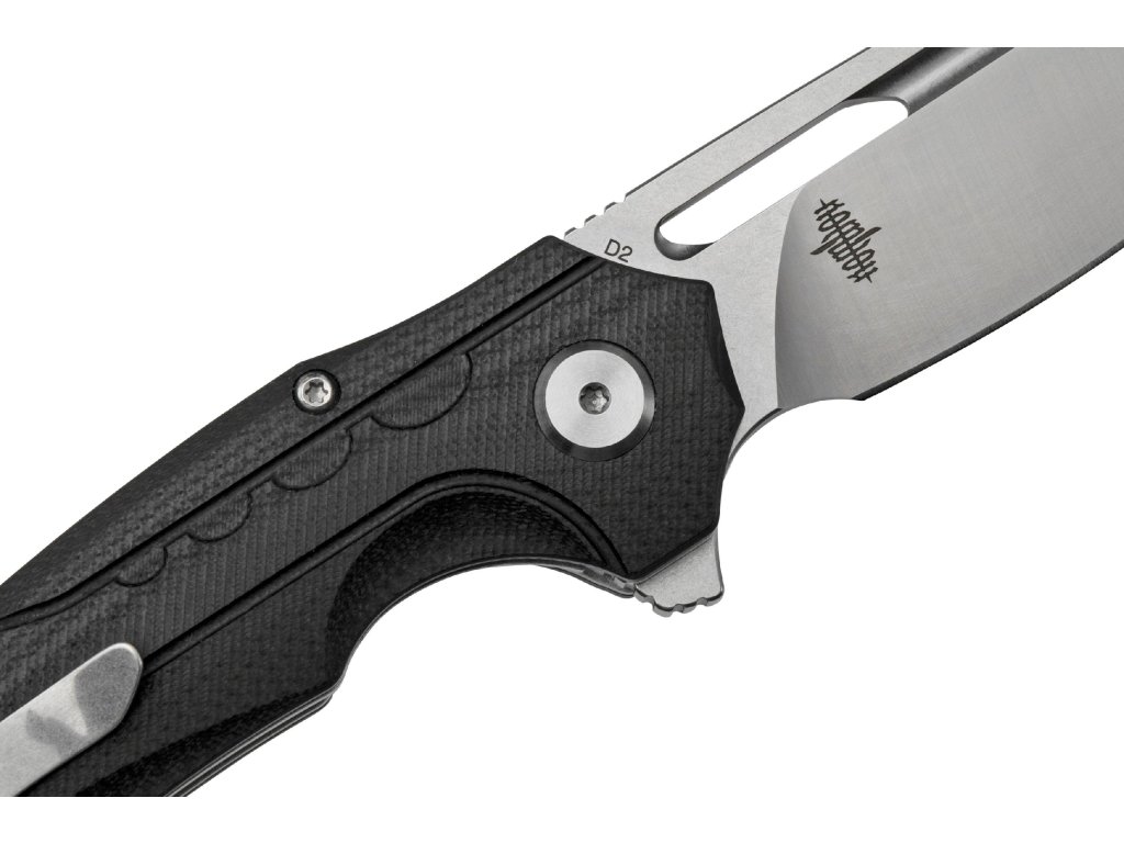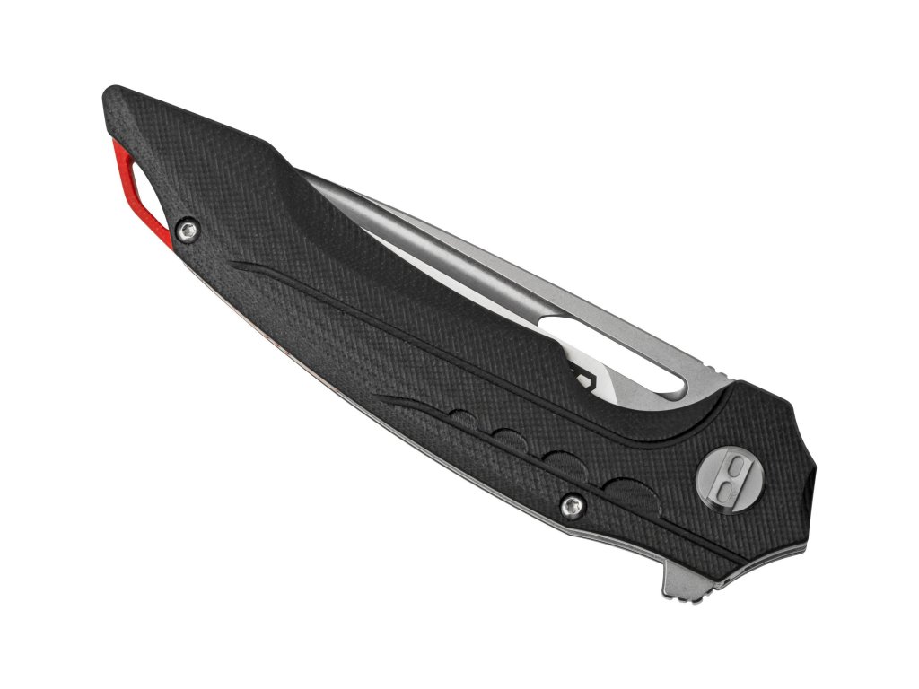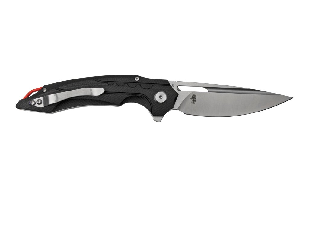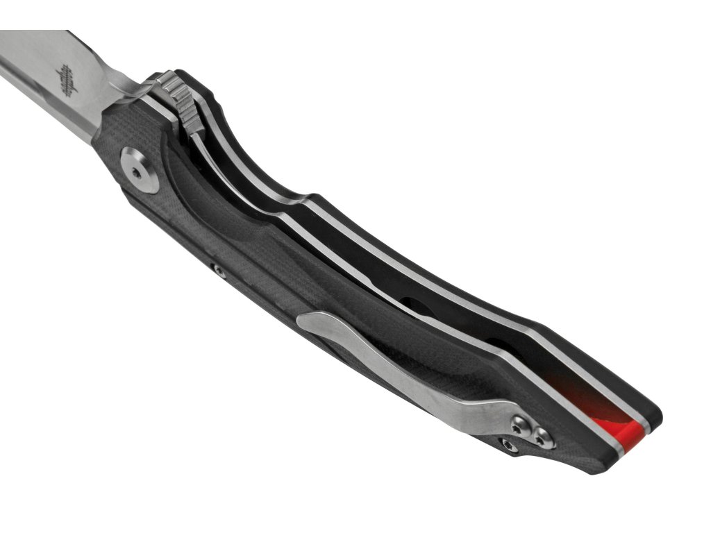 Rękojeść wykonana z czarnego G10 jest odporna na wilgoć, uderzenia i zmiany temperatur. Profilowane okładziny zapewniają wygodę i bezpieczeństwo użytkowania. Nóż dobrze leży w dłoni i umożliwia precyzyjną kontrolę ruchu.
