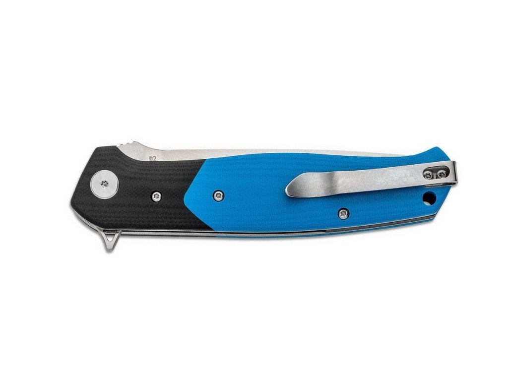 Rękojeść z teksturowanego kompozytu G10 w kolorach czerni i niebieskiego zapewnia pewny chwyt nawet w trudnych warunkach. Dzięki ergonomicznemu profilowi i solidnej konstrukcji nóż leży stabilnie w dłoni, co zwiększa bezpieczeństwo użytkowania.