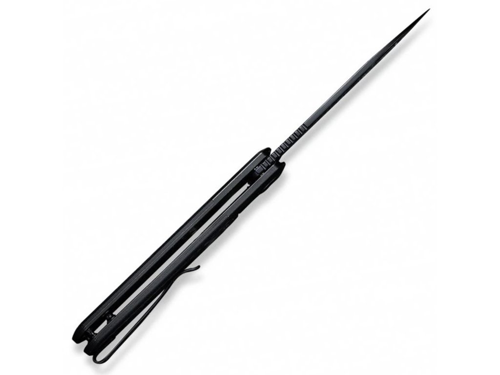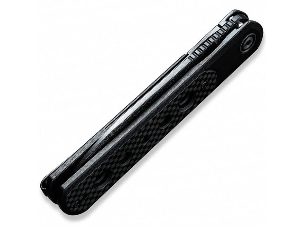 Rękojeść z nierdzewnej stali z okładzinami z G10 i wykończeniem z włókna węglowego gwarantuje pewny chwyt oraz przyciąga wzrok. Nóż wyposażony jest w solidną blokadę typu frame lock, stalowy klips do głębokiego noszenia (deep carry) oraz wygodne otwieranie jedną ręką za pomocą flippera. Płynne otwieranie zapewniają ceramiczne łożyska.