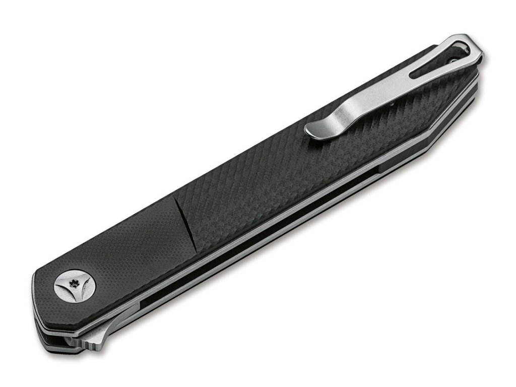- Klips typu tip-up – umożliwia dyskretne noszenie noża w kieszeni.