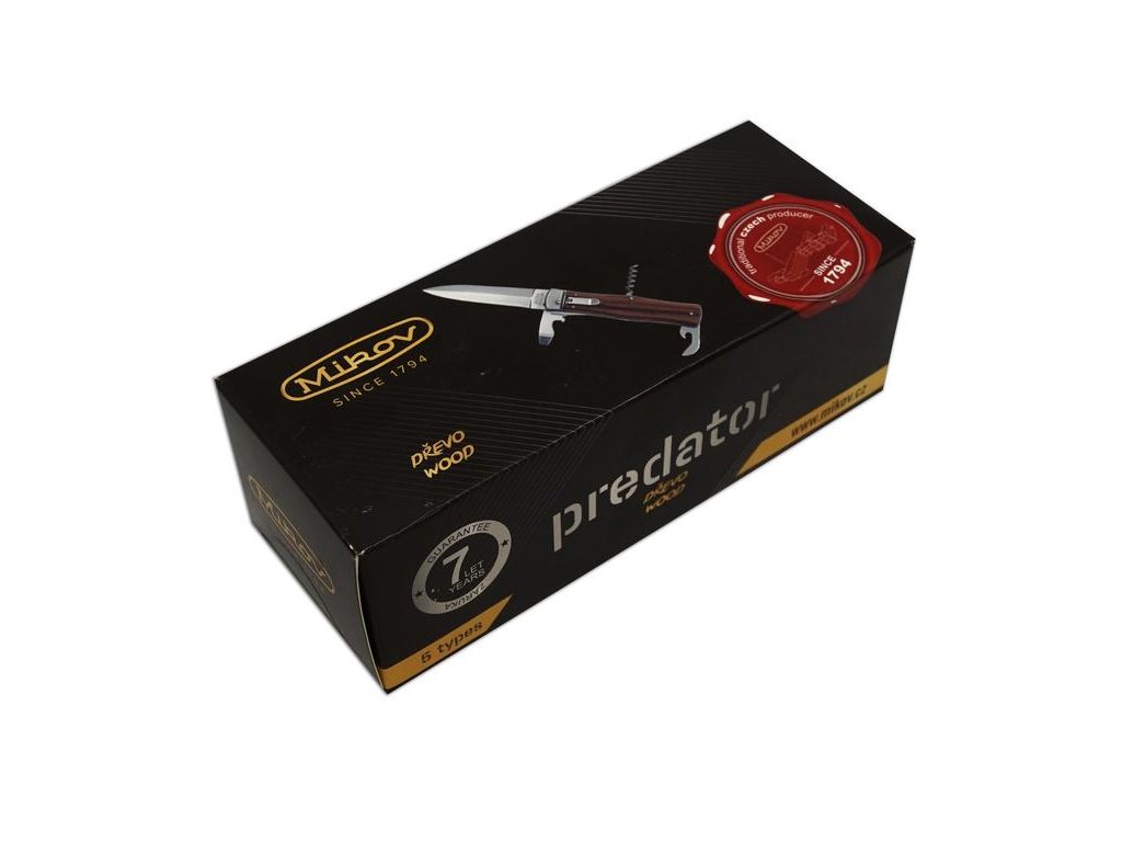 Mikov Predator Klasik 241-ND-4/KP to legendarny czeski nóż sprężynowy wyprodukowany w Mikulášovicach. Dzięki systemowi otwierania jedną ręką oraz solidnemu wykonaniu to doskonały wybór na co dzień i do kolekcji. Ostrze ze stali nierdzewnej, rękojeść z drewna palisandrowego i 5 funkcji użytkowych czynią z niego wszechstronne narzędzie o luksusowym wyglądzie.