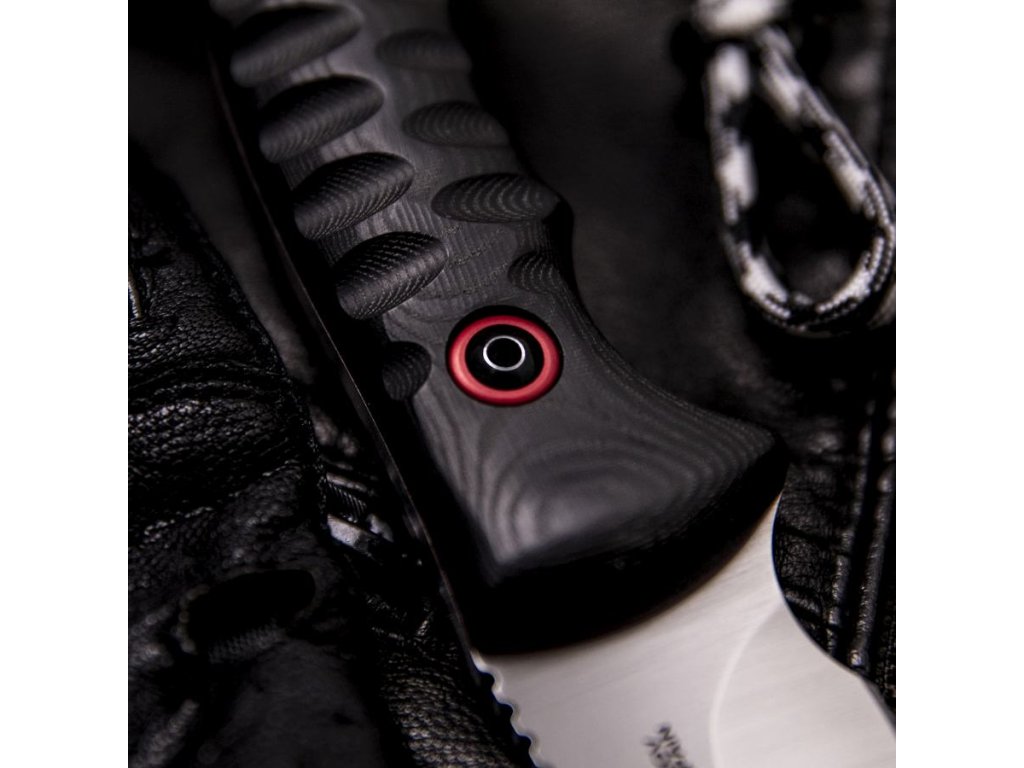 - Rękojeść: Micarta, czarna z czerwonymi pierścieniami