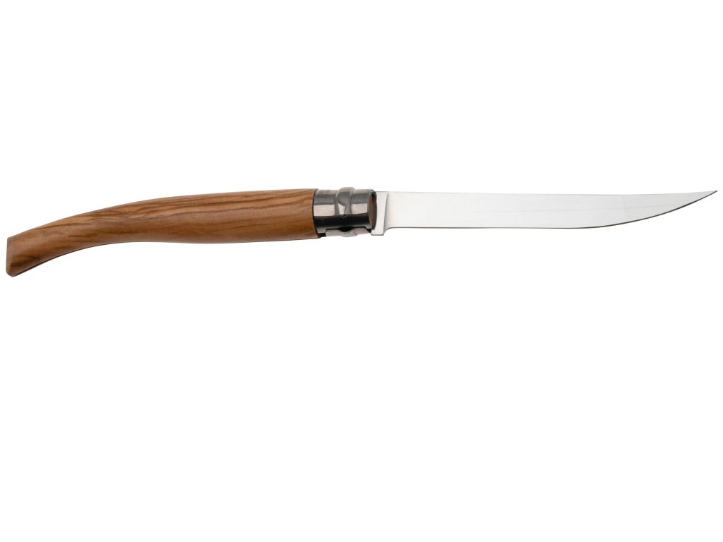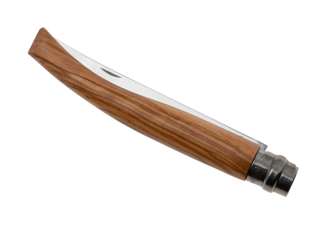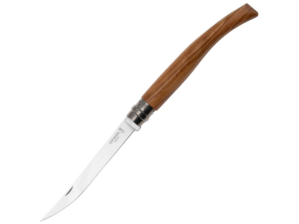 Podsumowanie: Opinel Effilé Oliva N°12 – smukły nóż składany z oliwnego drewna i ostrzem Sandvik 12C27, idealny do filetowania i eleganckiego serwowania.
