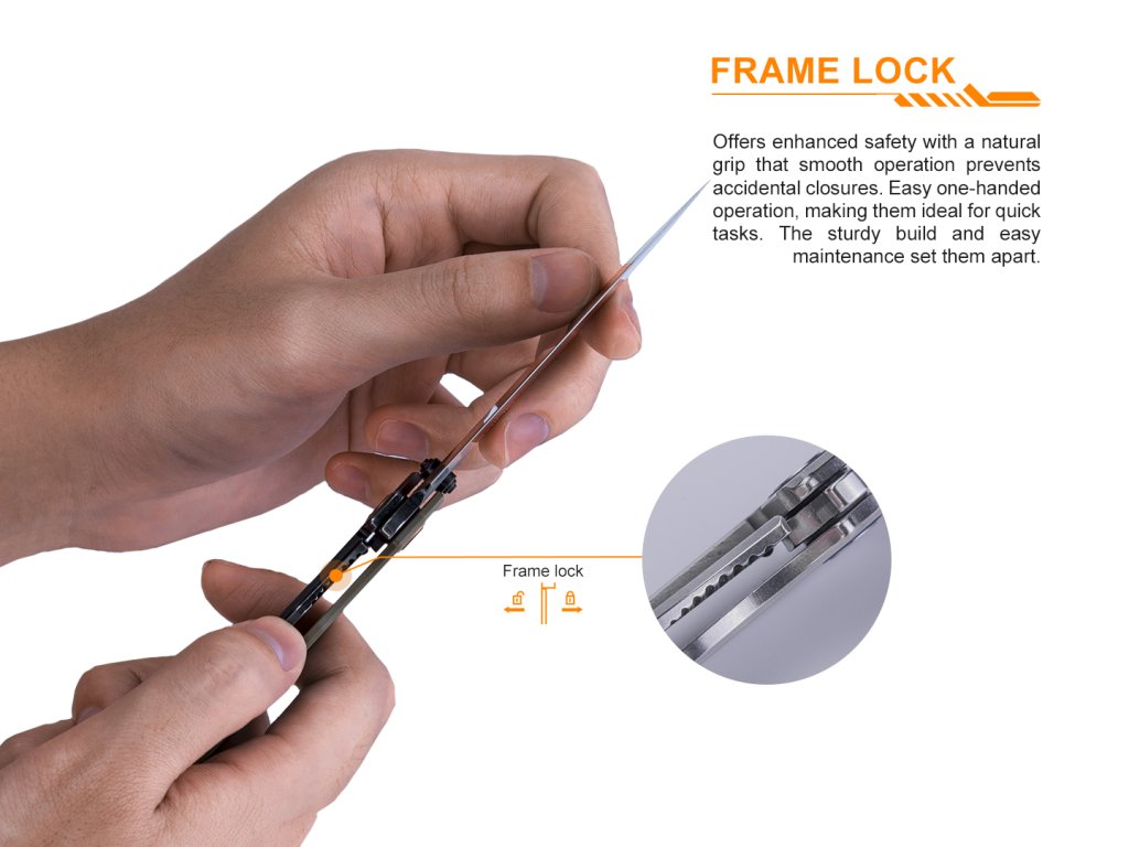 Nóż posiada blokadę frame lock zwiększającą bezpieczeństwo użytkowania. Flipper i łożyska kulkowe zapewniają szybkie, płynne otwarcie. Stalowy klips umożliwia wygodne noszenie w kieszeni jako element EDC.