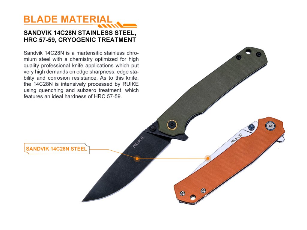 Ostrze o długości 86 mm wykonane ze stali Sandvik 14C28N gwarantuje odporność na korozję i świetne trzymanie krawędzi. Rękojeść łączy stal nierdzewną z teksturą G10, zapewniając pewny chwyt w każdych warunkach.