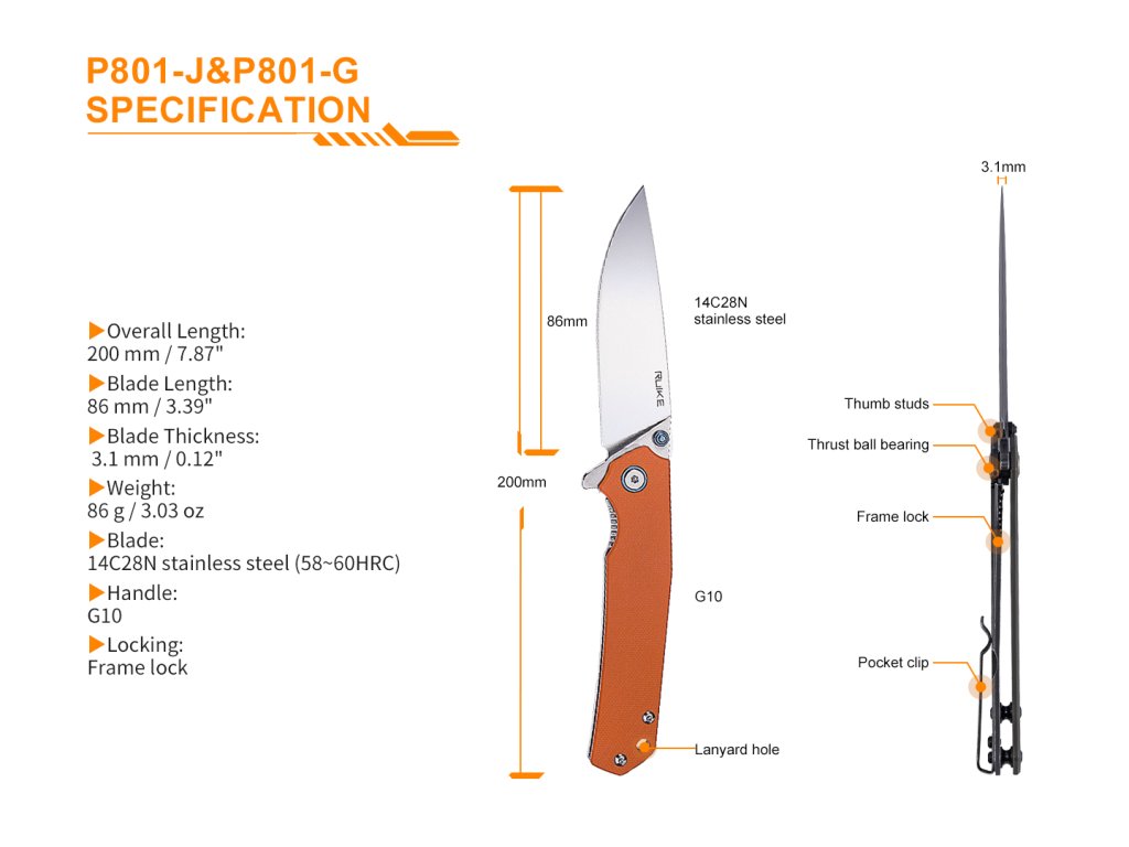 Ruike P801 w energetycznym pomarańczowym kolorze łączy nowoczesny design z wysoką funkcjonalnością. Dzięki niezawodnej stali Sandvik 14C28N oraz konstrukcji na łożyskach kulkowych oferuje płynne otwieranie i trwałą ostrość, idealną do codziennych zadań.