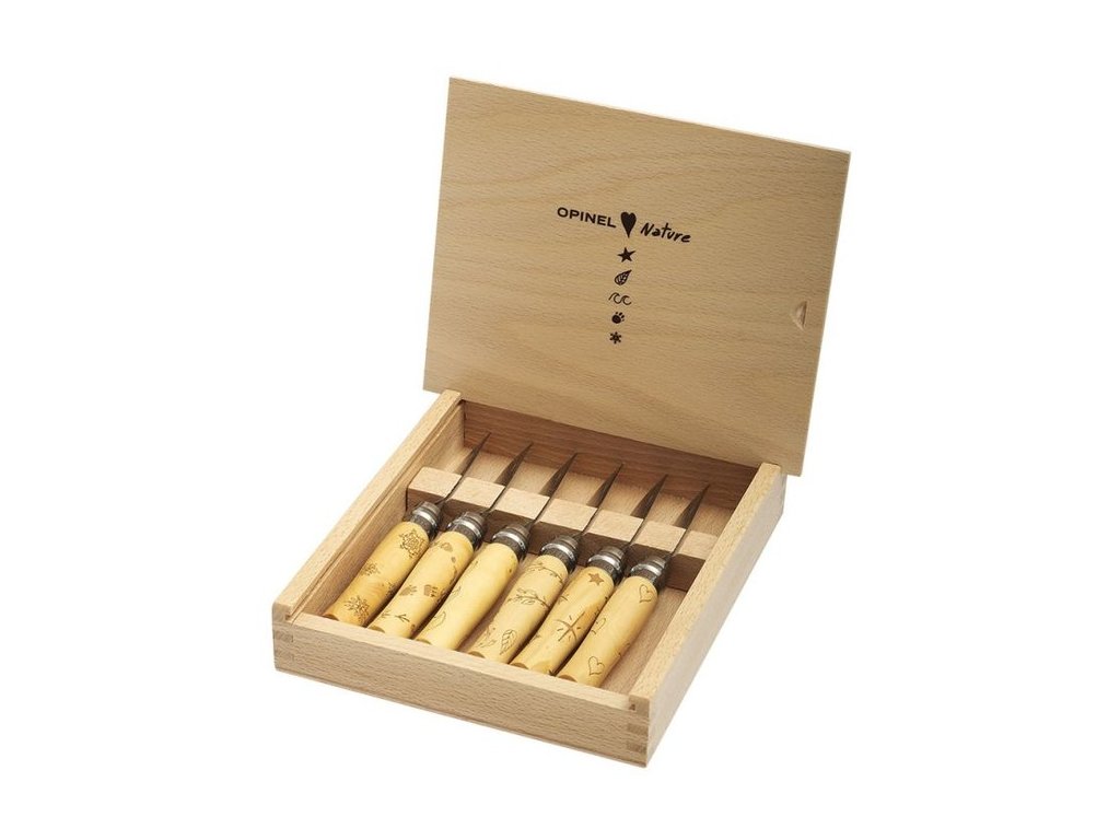 Opinel Nature VRI Inox N°7 to wyjątkowy zestaw sześciu składanych noży z klasycznej francuskiej serii Opinel. Każdy nóż ma rękojeść z drewna bukowego ozdobioną motywami natury – liśćmi, śnieżynkami, sercami, gwiazdkami, falami i śladami łap. Zestaw zapakowany jest w eleganckie drewniane pudełko, co czyni go idealnym prezentem dla miłośników outdooru, survivalu i dobrego smaku.