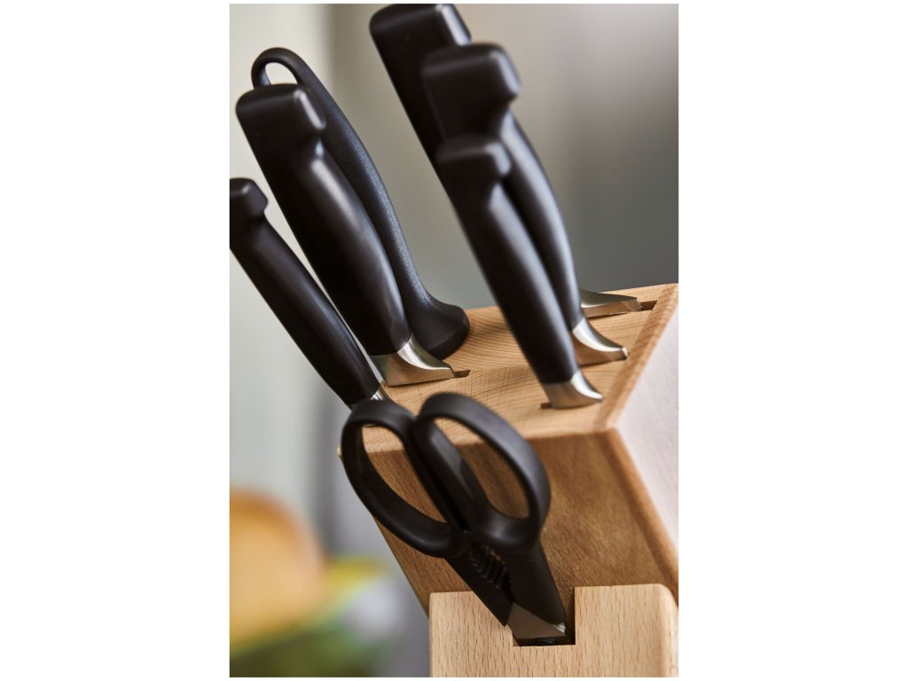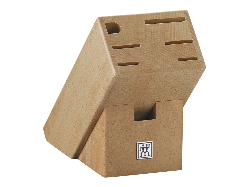 - Drewniany blok: Wykonany z buku – elegancki sposób przechowywania i ochrony ostrzy.