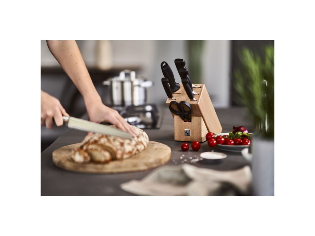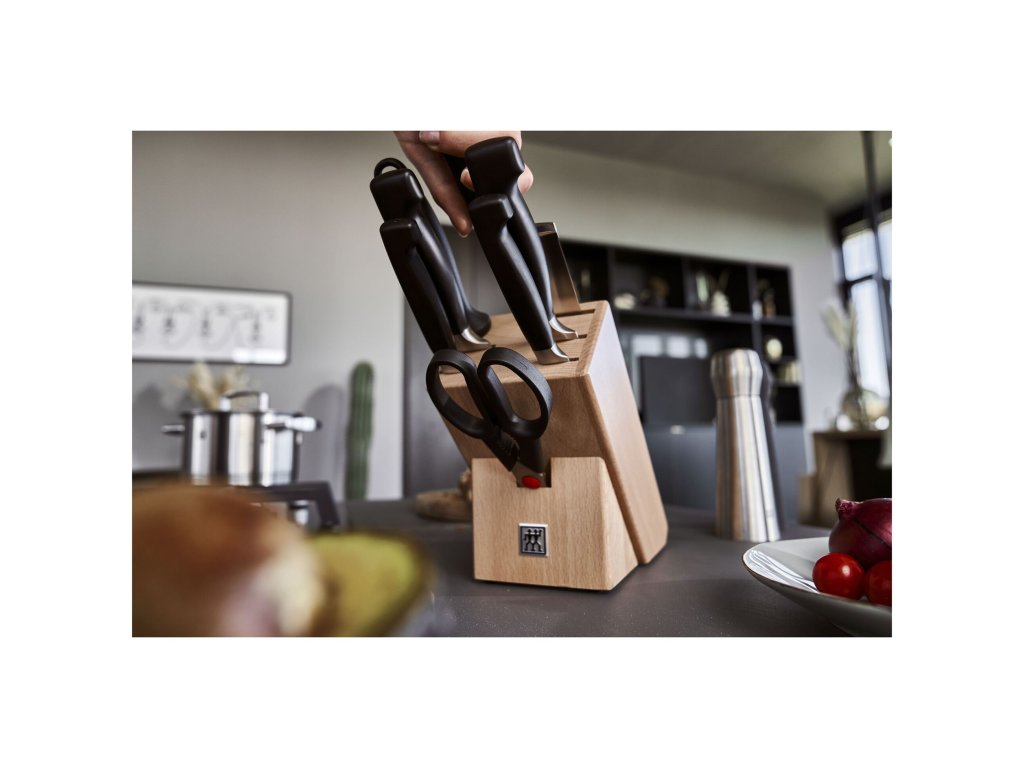 Zestaw Zwilling Four Star to 8-elementowy komplet, który spełni wymagania profesjonalistów i pasjonatów gotowania. W skład zestawu wchodzą najważniejsze noże kuchenne, ocierka, nożyczki i elegancki blok z drewna bukowego. Idealny balans między jakością, funkcjonalnością i estetyką.